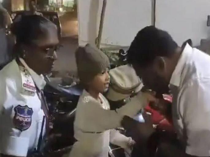 हैदराबादच्या उप्पल नल्लाचेरुवुमध्ये ही घटना घडली आहे. एक स्कूटर चालक त्याच्या लहान मुलाला घेऊन स्कूटर चालवत होता. यावेळी पोलिसांनी त्यांना थांबविले. स्कूटर चालक नशेत असल्याचे त्यांच्या लक्षात आले. यावेळी महिला पोलिसाने त्या मुलाला कवेत घेत त्याच्या बापाला भावनिक आवाहन केले.