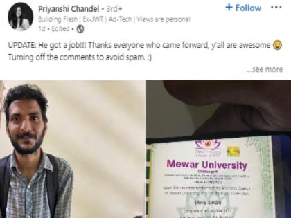 यानंतर प्रियांशीनं साहिलच्या ईमेलसोबत त्याची मार्कशीट आणि सर्टिफिकेट लिंक्डिनवर शेअर केली. कोणाकडे अॅडमिन बॉय, अॅडमिन वर्क, कस्टमर सपोर्टसारख्या कामासाठी नोकरी असले तर याची मदत करा असं तिनं म्हटलं. यानंतर अनेक लोक पुढे आले. काही लोकांनी त्याची युलू बाईकही रिचार्ज केली. तर काहींनी खाण्याची ऑर्डरही दिली. यानंतर प्रियांशीनं साहिलला नोकरी मिळाल्याचंही सांगितलं. "त्याला नोकरी मिळाली आहे. जे लोक मदतीसाठी पुढे आले त्यांची मनापासून आभार, तुम्ही सगळेच कमाल आहात," असं तिनं म्हटलं