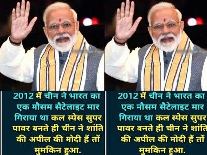 चीननं 2012मध्ये भारताचा हवामान उपग्रह पाडल्याच्या पोस्टही प्रसिद्ध झाल्या होत्या. परंतु याची पडताळणी केली असता, ते सर्व खोटं असल्याचं समोर आलं आहे. फेसबुकवर अमित शाह फॅन्स नावाचं पेज आहे. या पेजचे 612163 फॉलोअर्स आहेत. या पेजवर 1 एप्रिल रोजी पंतप्रधान नरेंद्र मोदींनी फोटोबरोबर एक दावा केला होता. 2012मध्ये चीननं भारताचा एक हवामान उपग्रह पाडला होता आणि आता भारतानं मिशन शक्ती केल्यानंतर शांत राहण्याचं आवाहन करत आहे. मोदींमुळेच हे शक्य झालं, असंही या पोस्टमध्ये लिहिलं आहे. या पोस्टवर अनेकांनी कमेंट्स केल्या असून, 130हून अधिक लोकांनी मोदींवर स्तुतिसुमनं उधळली होती. 2012मध्ये चीननं एक उपग्रह पाडला होता, परंतु तो भारताचा नव्हता, असंही उघड झालं आहे.