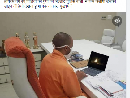 योगी आदित्यनाथ यांच्यात या फोटोत ते पीडित मुलीच्या मृतदेहावर होत असलेले अंत्यसंस्कार लाईव्ह बघत असल्याचं दिसत आहे. हा फोटो सोशल मीडियात शेअर करून मुख्यमंत्री योगी आदित्यनाथ बलात्कार झालेल्या पीडितेचे अंत्यसंस्कार मध्यरात्री कार्यालयात बसून लाईव्ह बघत होते असा दावा करण्यात आला आहे.