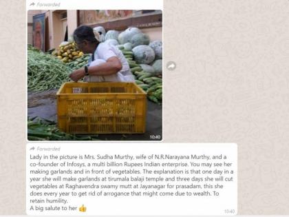 हा फोटो सोशल मीडियावर व्हायरल होत असताना एक मेसेज सुद्धा व्हायरल होत होता. या फोटोमधील स्त्री या सुधा मूर्ती असून आयटी सेक्टरच्या सर्वात मोठी कंपनी इन्फोसिसचे संस्थापक एन नारायण मूर्ती यांच्या पत्नी आहे. सुधा मुर्ती यांनी राघवेंद्र देवळाच्याआराधना उत्सवात दरवर्षीप्रमाणेच सहभागी झाल्या होत्या. त्या ठिकाणचा हा फोटो आहे. अनेकदा सुधा मुर्ती या या देवळात सेवेसाठी कार्यरत असतात. व्हायरल झालेला फोटो हा Kannada edition of Oneindia.com कडून प्रकाशित करण्यात आला होता. अनेका यु ट्यूब चॅनेल्सनी आराधना उत्सवात भाजी विकत असल्याचा दावा केला होता. हा दावा चुकीचा असून सुधा मुर्ती या उत्सवाच्यावेळी अनेकदा स्टोरेजची व्यवस्था सांभाळण्याचे कार्य करतात.