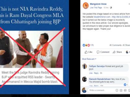 त्या फोटोमध्ये भाजपाचे राष्ट्रीय अध्यक्ष अमित शाह आणि छत्तीसगडचे माजी मुख्यमंत्री रमण सिंह यांच्याबरोबरच भगवी वस्त्रे परिधान केलेली आणखी एक व्यक्ती दिसत आहे. ती व्यक्ती दुसरी तिसरी कोणी नसून मक्का मशिदीत भीषण बॉम्बस्फोट प्रकरणावर निकाल देणारे न्यायाधीश रवींद्र रेड्डी असल्याची चर्चा आहे. परंतु त्याची पडताळणी केली असता ते खोटं असल्याचं समोर आलं आहे. भाजपाचे राष्ट्रीय अध्यक्ष अमित शाह आणि छत्तीसगडचे माजी मुख्यमंत्री रमण सिंह यांच्याबरोबर फोटोमध्ये दिसत असलेली व्यक्ती छत्तीसगड काँग्रेसचे माजी नेते रामदयाल उइके आहेत. गेल्या वर्षी ऑक्टोबरमध्ये त्यांनी भाजपामध्ये प्रवेश केला होता. मंगलोर व्हाइस या फेसबुक पेजवर ही पोस्ट टाकण्यात आली असून, त्यासंदर्भात त्यांनी स्पष्टीकरणही दिलं आहे.