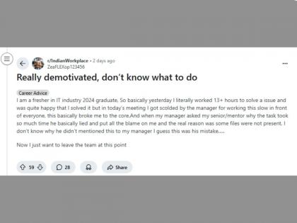 आयटी इंडस्ट्रीमध्ये फ्रेशर असलेल्या तरुणाने लिहिलं की, गेल्या वर्षी कॉलेजमधून ग्रॅज्युएट झालो. एका समस्येचे निराकरण करण्यासाठी मला १३ तासांपेक्षा जास्त वेळ लागला. समस्या सोडवल्यानंतर मी खूप आनंदी होतो, पण एका टीम मीटिंगमध्ये, माझा मॅनेजर मला सर्वांसमोर मी स्लो असल्याचं म्हणत माझ्यावर ओरडला. यामुळे मी आतून तुटलो आहे.