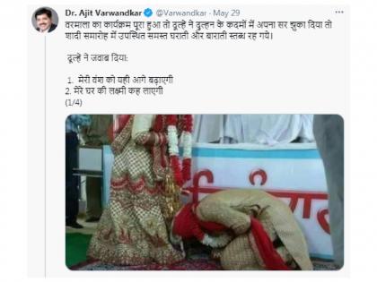 ट्विटरवर व्हायरल झालेला हा फोटो डॉ. अजीत वारवंडकर यानी त्यांच्या ट्विटर अकाउंटवर शेअर केला आहे. हा फोटो शेअर करत असताना त्यांनी मनाला आनंद देणारं एक कॅप्शनही शेअऱ केलं आहे. डॉ. अजीत यांनी लिहिले की, 'वरमाला घालण्याचा कार्यक्रम पूर्ण झाल्यावर नवरदेव नवरीच्या पाया पडला तेव्हा लग्नात उपस्थित पाहुणे आणि घरातील लोक स्तब्ध झालेत.'.