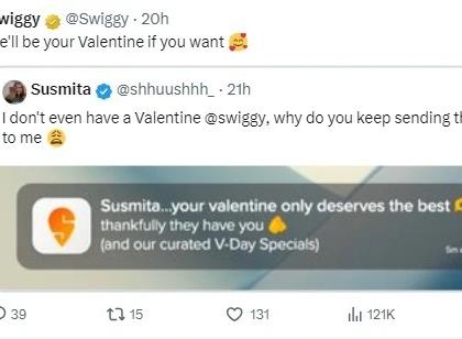 इतर ॲप्सप्रमाणे स्विगीनेदेखील सुष्मिता नावाच्या आपल्या ग्राहकाला व्हॅलेंटाईन डेनिमित्त ऑफरचे नोटिफिकेशन पाठवले. सुष्मिताने या नोटिफिकेशनचा स्क्रीनशॉट घेतला आणि तो ट्विटरवर शेअर करत लिहिले- 'माझ्याकडे कुणीच व्हॅलेंटाइन नाही, स्विगी...असे मेसेज का पाठवता?' या पोस्टमध्ये तिने स्विगीला टॅग केले.