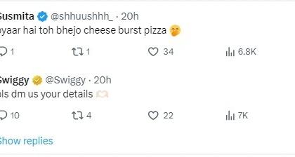 यावर उत्तर देताना स्विगीने म्हटले- 'तुम्हाला हवे असेल तर आम्ही तुमचे व्हॅलेंटाइन बनू शकतो.' यावर सुष्मिताने लिहिले- 'प्रेम असेल तर चीज बर्स्ट पिझ्झा पाठवा.' यानंतर स्विगीने तरुणीला तिचा पत्ता विचारला.