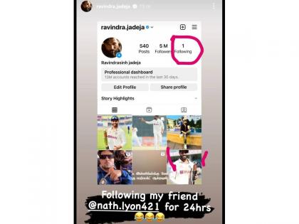 ३४ वर्षीय रवींद्र जाडेजा या सामन्यानंतर ऑस्ट्रेलियन फिरकीपटू नॅथन लायनच्या फॉलो करू लागला. तो आता फक्त इंस्टाग्रामवर लायनला फॉलो करतो. त्याचा स्क्रीनशॉटही त्याने त्याच्या इंस्टाग्राम स्टोरीमध्ये शेअर केला आहे. जाडेजाने सांगितले की, तो २४ तास नॅथन लायनला फॉलो करत आहे. अशा स्थितीत जाडेजाने एखादी पैज हरली आहे की असे करण्यामागे आणखी काही कारण आहे, याचा चाहतेही विचार करत आहेत. पण जाडेजाने मात्र नॅथन लायनला आपला मित्र म्हटले आहे.
