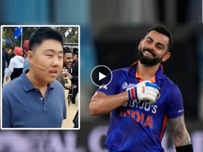 Virat Kohli Chinese Fan, Viral Video: भारताने बांगलादेशवर टी२० विश्वचषक सामन्यात विजय मिळवला आणि सेमीफायनल मधील प्रवेश जवळपास निश्चित केला. मात्र सध्या या सामन्यापूर्वीचा एक व्हिडिओ सोशल मीडियावर चांगलाच व्हायरल होत आहे. व्हायरल व्हिडीओमध्ये टीम इंडियाचा माजी कर्णधार विराट कोहली याचा एक चायनीज चाहता साऱ्यांची मनं जिंकताना दिसतोय. त्याच्या भावना कोट्यवधी भारतीयांच्या हृदयाला भिडणाऱ्या आहेत. चीनमधून आलेला कोहलीचा हा चाहता भारतावर खूप प्रेम करतो आणि तो फक्त कोहलीसाठी हा सामना पाहण्यासाठी आला आहे, असे म्हणताना व्हिडीओत ऐकू येते. गंमत म्हणजे हा चायनीज हे सगळं अस्खलित हिंदीत बोलताना दिसतो.