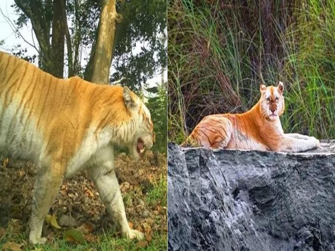दुर्मीळ गोल्डन टायगर कॅमेरात कैद, भारतात फक्त एकच शिल्लक; पाहा व्हायरल फोटो