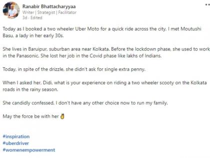 रणबीर यांनी त्यांच्या पोस्टमध्ये लिहिलं- "आज मी उबेर मोटोद्वारे शहरात जाण्यासाठी बाईक बुक केली, त्यामुळे माझी मौतुशी बसू (Moutushi Basu) नावाच्या महिलेशी भेट झाली. ती 30 वर्षांची आहे. ती कोलकात्यापासून काही अंतरावर असलेल्या बरुईपूरमध्ये राहते. लॉकडाऊनपूर्वी ती Panasonic कंपनीत काम करत होती. पण लाखो भारतीयांप्रमाणे तिलाही कोरोना काळात नोकरी गमवावी लागली. आज पाऊस पडत असतानाही तिने माझ्याकडे एक रुपयाही जादा मागितला नाही. जेव्हा मी तिला विचारलं की, पावसाळ्यात कोलकात्यातील रस्त्यावर दुचाकी चालवण्याचा त्याचा अनुभव कसा होता, तेव्हा तिने सांगितलं की घर चालवण्यासाठी पैसे कमवण्याचा दुसरा कोणताही मार्ग माझ्याकडे नाही. देव तिला आशीर्वाद देवो."