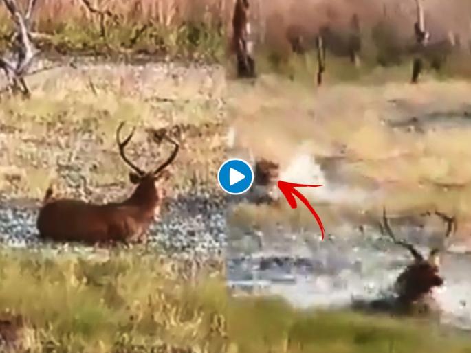 व्हायरल होणाऱ्या व्हिडिओमध्ये तुम्ही पाहू शकता की हरण तलावातील पाण्यात अतिशय आरामात उभा आहे. हा व्हिडिओ पाहून असं वाटतं की त्याला आपल्या आसपास असलेल्या धोक्याची चाहूल लागलेली आहे. याच कारणामुळे ते एकटक आपल्या आजूबाजूला पाहत आहे. इतक्यात एक बिबट्या झाडीतून बाहेर येतो आणि हरणावर हल्ला करतो. यानंतर हरण आपला जीव वाचवण्यासाठी तिथून पळ काढतं.