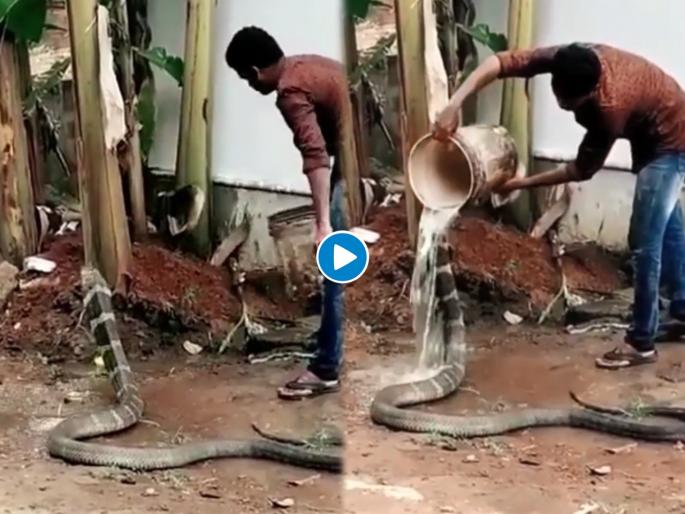 व्हायरल व्हिडिओमध्ये, आपण पाहू शकता की, एक माणूस कोब्राजवळ जातो. बाजूलाच पडलेल्या बादलीत पाणी भरुन घेतो, आणि या कोब्राच्या फण्यावर टाकतो. हा कोब्रा उंच फणा काढून त्याच्याकडे पाहात आहे, हे पाहिल्यानंतर कुणालाही भीती वाटेल, मात्र हा सर्पमित्र अगदी शांतपणे हे सगळं करत आहे. विशेष म्हणजे कोब्राच्या फण्यावर पाणी टाकल्यानंतरही तो शांतच राहतो, कुठलाही हल्ला करत नाही.