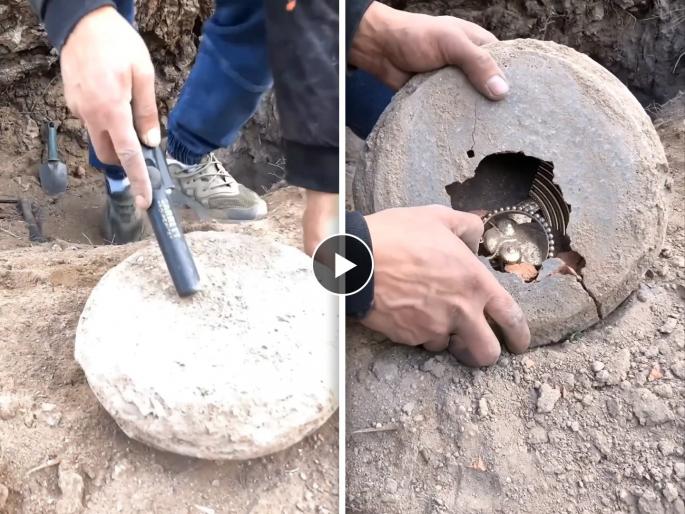 पूर्वीच्या काळात लोक त्यांच्याकडील पैसे, दागिने हे जमिनीमध्ये किंवा भींतीमध्ये लपून ठेवत होते जेणेकरून ते चोरी होऊ नये. अशात काही मातीच्या भांड्यांमध्ये किंवा धातुच्या जारमध्ये हे दागिने, नाणी ठेवली जात होते. नुकताच एक व्हिडीओ व्हायरल झाला असून एका व्यक्तीच्या हाती असाच एक जुना खजिना लागला आहे. तो जमिनीत खोदकाम करत होता. तेव्हा त्याला एक दगडासारखी वस्तू सापडली. जी उघडल्यावर तो अवाक् झाला.