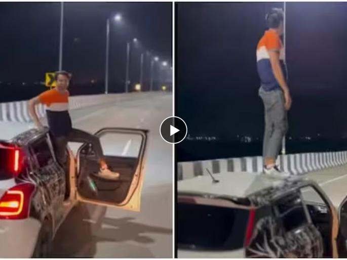 मुंबईतील एका फ्लायओव्हरवरील हा व्हिडीओ आहे. यात एक तरूण चालत कारमधून बाहेर येतो आणि स्टेअरिंग सोडून कारच्या छतावर जाऊन उभा राहतो. या कारवर राजस्थानची नंबर प्लेट आहे. हा धक्कादायक व्हिडीओ सोशल मीडियावर व्हायरल झाला असून लोक त्यांवर टिका करत आहेत.