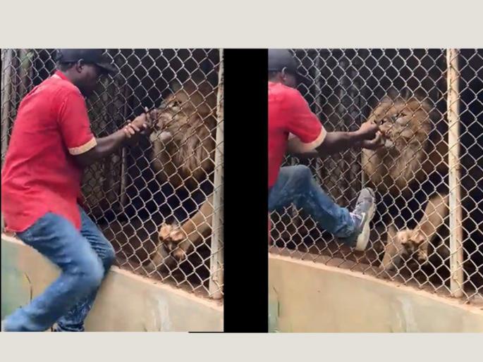 व्हायरल होत असलेल्या व्हिडिओमध्ये हा व्यक्ती सिंहाच्या पिंजऱ्याबाहेर उभा असल्याचं दिसतं आणि पिंजऱ्याच्या आतून सिंह त्याला पाहत आहे. सिंहाला इतक्या जवळून पाहूनही या व्यक्तीचं समाधान होत नाही आणि तो पिंजऱ्याच्या आतमध्ये बोटं घालून सिंहासोबत खेळू लागतो. ही गोष्टी जंगलाच्या राजाला अजिबातही आवडत नाही. सुरुवातीला तो काहीच करत नाही, पण थोड्या वेळाने रागावलेला सिंह या व्यक्तीची बोटं आपल्या जबड्यात पकडतो. यानंतर मात्र या व्यक्तीला घामच फुटतो. खूप प्रयत्नानंतर तो आपला हात सिंहाच्या जबड्यातून बाहेर काढण्याच यशस्वी ठरतो. मात्र यात त्याच्या हाताच्या बोटाची हाडंच वाचली आणि मांस सिंहाने ओढून खाल्लं