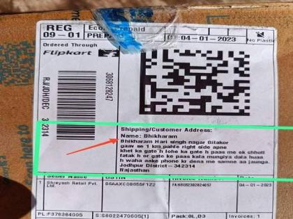 हा फोटो ४ जानेवारी रोजीचा आहे. हा पत्ता जोधपूर मधील आहे, भिखाराम नावाच्या व्यक्तीने काही वस्तू मागवल्या होत्या. त्या व्यक्तीने आपला पत्ता भन्नाट लिहिला आहे. यात 'भिखाराम, हरिसिंह नगर. गिलाकोर गावाच्या १ किलोमीटर आधी उजव्या बाजूला त्यांच्या शेताच गेट आहे. ते लोखंडी गेट आहे. जवळच एक लहान गेट आहे आणि गेटजवळ काळे कापड लावले आहे. तिथे येऊन फोन करा. मी पुढे येईन.' असं या पत्त्यात लिहिले आहे.