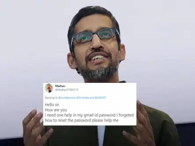 नवी दिल्ली: कधी कधी आपण सोशल मीडिया अकाऊंट्स, ई-मेल अकाऊंट्सचा पासवर्ड विसरतो. अशा परिस्थितीत फॉरगॉट पासवर्डचा वापर करून नवा पासवर्ड तयार करता येतो. यामुळे अवघ्या काही मिनिटांत पासवर्डची समस्या दूर होते. नवा पासवर्ड तयार करून आपलं अकाऊंट वापरता येतं. जी-मेलचा पासवर्ड विसरल्यावर कोणी थेट कंपनीच्या मुख्य कार्यकारी अधिकाऱ्याशी संपर्क साधत नाही. पण एका जीमेल वापरकर्त्यानं आपली समस्या थेट गुगलचे सीईओ सुंदर पिचाईंना सांगितली आणि मदतीचं आवाहन केलं.भारतातील कोरोना रुग्णांचा आकडा दिवसागणिक झपाट्यानं वाढत आहे. देशातील आरोग्य व्यवस्थेवर खूप मोठा ताण आहे. ऑक्सिजन सिलिंडर, रेमडेसिविर इंजेक्शन, औषधांचा तुटवडा जाणवू लागला आहे. त्यामुळे जगभरातून भारतासाठी मदतीचा ओघ सुरू आहे. या पार्श्वभूमीवर सुंदर पिचाईंनी भारतासाठी मदतीची घोषणा केली. त्यांनी ट्विट करून मदतीची माहिती दिली. त्यांच्या ट्विटला एका ट्विटर वापरकर्त्यानं उत्तर दिलं.VIDEO: चल बाहेर निघ! लग्न लागत असताना पोलीस आले मंडपात; धक्के मारत काढली नवरदेवाची 'वरात''हॅलो सर, तुम्ही कसे आहात? मला जीमेल आयडी पासवर्डबद्दल एक मदत हवी आहे. पासवर्ड कसा रिसेट करायचा ते मी विसरलो आहे. कृपया मदत करा,' असं आवाहन @Madhan67966174 नावाच्या एका ट्विटर वापरकर्त्यानं केलं. या व्यक्तीला पिचाईंनी उत्तर दिलेलं नाही. मात्र अन्य वापरकर्त्यांनी यावर मजेशीर कमेंट केल्या आहेत. मूळचे भारतीय असलेल्या सुंदर पिचाईंनी गुगलच्या वतीनं भारताला १३५ कोटी रुपयांची मदत जाहीर केली आहे.