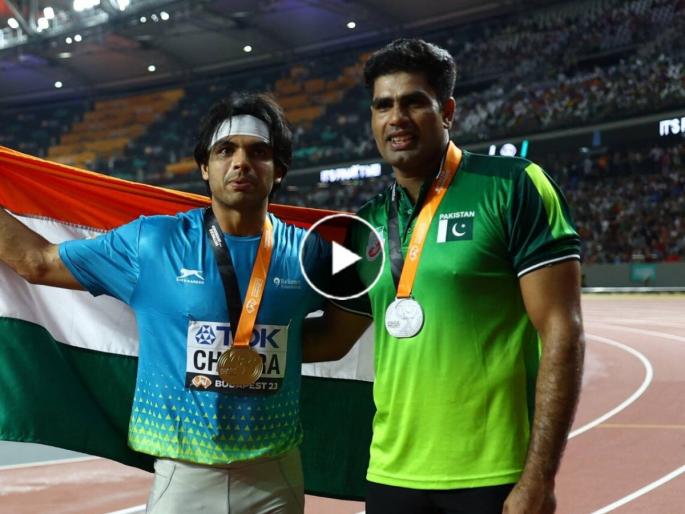 Neeraj Chopra Arshad Nadeem, India Pakistan: भारतीय स्टार भालाफेकपटू नीरज चोप्राने सुवर्णपदक जिंकले. पोस्ट मॅच प्रेंझेटशनमध्ये तिरंगा फडकावल्यानंतर आणि राष्ट्रगीत गायल्यानंतर जल्लोष झाला. चोप्राने भारतासाठी ऐतिहासिक पहिले सुवर्णपदक जिंकले. दुसऱ्या संधीत 88.17 च्या फेकीसह त्याने स्पर्धेत दमदार प्रवेश केला. पाकिस्तानच्या अर्शद नदीमने 87.82 अंतरासह रौप्य पदक जिंकले, हे त्याच्या देशासाठी पहिले जागतिक अजिंक्यपद पदक ठरले. तर झेक प्रजासत्ताकच्या जाकुब वडल्जेने गेल्या वर्षी ओरेगॉनमध्ये 86.67 अंतरासह जिंकलेले कांस्यपदक कायम ठेवले. या दरम्यान, कॅमेरामनला पोज देताना नीरजने असे काही केले की त्याने संपूर्ण जगाची मने जिंकली. कट्टर विरोधक असलेल्या पाकिस्तानच्या रौप्यपदक विजेत्या खेळाडू अर्शद नदीमलाही त्याने व्यासपीठावर पोज देण्यासाठी बोलावले. दोघांनीही कॅमेऱ्यासमोर पोज दिली आणि सांगितले की, प्रयत्न केले तर प्रेम आणि मैत्रीचा संदेशही देता येईल.