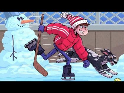 वर दिलेल्या चित्रात एक आनंदी मुलगा बर्फावर आईस स्केटिंग करताना दिसत आहे. त्याच्या एका हातात हॉकी स्टिक आहे आणि तो बर्फावर मजा करत आहे.