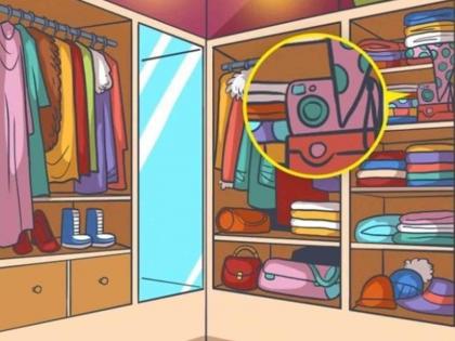 या फोटोत तुम्हाला एक कपाट दिसत आहे. ज्यात खूपसारे कपडे आणि काही वस्तू ठेवल्या आहेत. यात एक कॅमेराही लपवण्यात आला आहे. अशा फोटोंमध्ये गोष्टी इतक्या हुशारीने लपवलेल्या असता की, जेणेकरून तुमच्या मेंदुला जास्त चालना मिळावी. तेच या फोटोबाबत आहे. यात कॅमेरा शोधण्यासाठी तुमच्या १० सेकंदाची वेळ आहे.