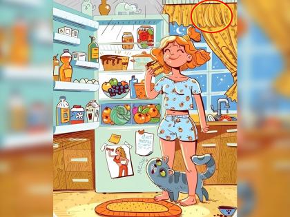तुमच्यासमोर असलेल्या फोटोत तुम्हाला किचनमधील दृश्य दिसत आहे. फ्रीज उघडा आहे आणि त्यात ठेवलेले पदार्थ, भाज्याही दिसत आहे. एक मुलगी उभी राहून केस खात आहे. मागे बेसिनमध्ये काही भांडी आहेत. तसेच मागे पडदाही दिसत आहे. खिडकीतून बाहेर तारे आणि चंद्र दिसत आहे. सोबतच या फोटोत केळी आहेत. त्याच तुम्हाला शोधायच्या आहेत. पण त्या शोधण्यासाठी तुम्हाला खूप मेहनत घ्यावी लागणार आहे.
