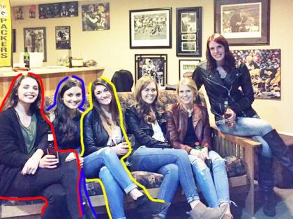 या साठी तुम्हाला हा फोटो खूप निरखून पहावा लागणार आहेत. गायब असलेले दोन पाय खरेच दिसत नाहीएत. परंतू पहिल्या तीन मुली अशा स्थितीत बसल्या आहेत की एकीचा एक पाय आणि दुसरीचा एक पाय पायांमागे गायब झाले आहेत. अनेकजण म्हणताहेत की फोटोशॉपद्वारे पाय गायब केलेत. परंतू तसे नाहीय.