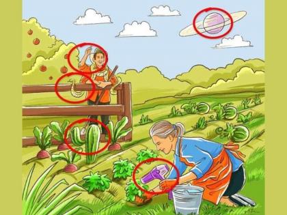 तुमच्यासमोर असलेल्या फोटोत तुम्हाला एक शेत दिसत आहे. त्यात एक पुरूष आणि एक महिला दिसत आहे. महिला शेतात काम करत आहे. झाडांना स्प्रे ने पाणी देत आहे. पण या फोटोत पाच चुका आहेत ज्या तुम्हाला शोधायच्या आहेत. अर्थात हे काही सोपं काम नाही. या चुका शोधण्यासाठी तुमच्याकडे तीक्ष्ण नजर असायला हवी. तरच तुम्हाला यात यश मिळेल.