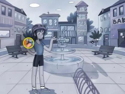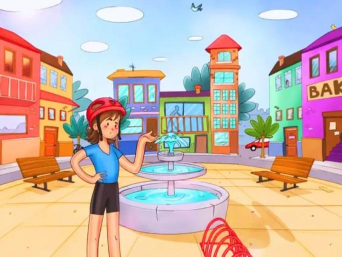 या फोटोत तुम्हीला काही इमारती, पाण्याचा कारंजा, दोन बेंच, एक कार, काही झाडी दिसत आहेत. तसेच मुलगी सायकल स्टॅंडजवळ उभी आहे. पण तिथे तिची सायकल नाहीये. तिला प्रश्न पडलाय की, सायकल गेली कुठे? चला तर मग लागा कामाला.