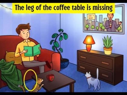 या फोटोत एक मुलगा सोफ्यावर पुस्तक घेऊन बसला आहे आणि समोर टीव्ही न्यूज चॅनल सुरू आहे. त्यासोबतच दोन मांजरीही दिसत आहेत आणि टीव्हीखाली कॅबिनेटवर एक लॅम्प ठेवला व एक प्लांटही ठेवला आहे. एक प्लांट जमिनीवरही ठेवला आहे. सोफ्यासमोर एक टेबल आहे ज्यावर एक कॉफी मग ठेवला आहे. या फोटोत तुम्हाला एक चूक शोधायची आहे.