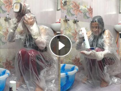 girl takes bath covering body with plastic polythene : new idea unlock girl takes bath while covering full body with plastic polythene to protect herself from cold : आंघोळ करताना थंडी वाजू नये म्हणून केलेला खास उपाय, प्रचंड व्हायरल होत आहे... ...