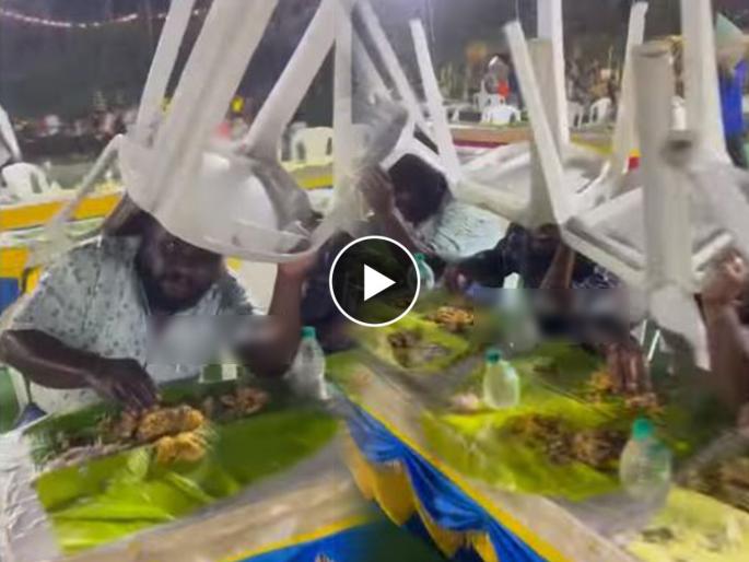 या व्हायरल व्हिडीओमध्ये तुम्ही पाहू शकता एका लग्नसमारंभामध्ये पाहुणे जेवायला बसले आहेत. त्याचवेळी जोरदार पाऊस पडायला सुरुवात होते. मात्र यावेळी आपल्या जागेवरून उठून न जाता हे पाहुणे तिथे ठेवलेल्या खुर्च्या एका हाताने डोक्यावर पकडून आरामात बसून जेवत आहेत. मुसळधार पावसातही पाहुण्यांनी जेवण सोडले नाही, तर पावसाचा आनंद घेत जेवणाचाही आनंद लुटला.