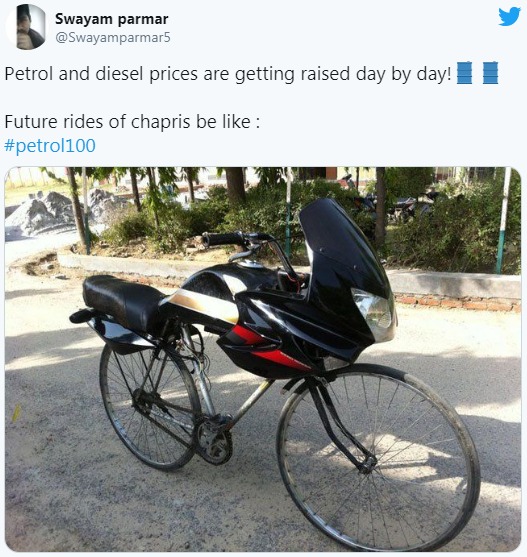 सोशल मीडियावर लोक फनी व्हिडीओज, जोक्स शेअर करून आपलं दुःख मांडत आहे. पेट्रोलचे भाव वाढताच सोशल मीडियावर युजर्सनी मीम्सचा वर्षाव करायला सुरूवात केली होती. लोकांनी वेगवेगळ्या वाहनांना सायकलचे पार्ट्स जोडत पेट्रोलमुक्त वाहन तयार करण्याचा प्रयत्न केला आहे. Flying dosa Video : लय भारी! मुंबई मॅनच्या 'Flying Dosa’ टेक्निकनं जगाला लावलं वेडं; पाहा जबरदस्त व्हिडीओ
