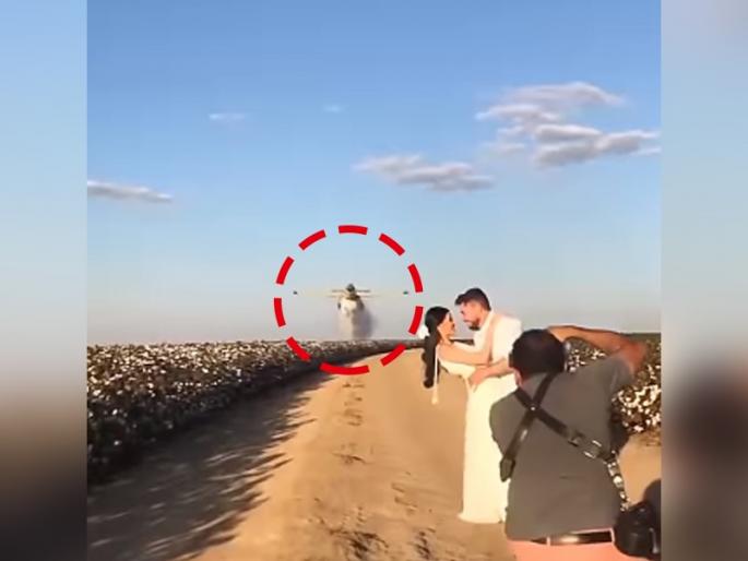 व्हायरल होणाऱ्या व्हिडीओत एक कपल प्री वेडिंग फोटोशूट करताना दिसतंय. पण ते थेट एका प्लेनच्या समोर प्री वेडिंग फोटोशूट करत आहेत. ते फोटोसाठी मस्त पोजही देतात. पण त्यांच्या पाठीमागे हवेतून एक प्लेन प्रचंड वेगाने अवकाशाच्या दिशेला झेपावतं. यावेळी प्लेनच्या प्रचंड वेगामुळे जमिनीवरची धूळ मोठ्या प्रमाणात हवेत मिसळते. विशेष म्हणजे ते प्लेन थेट या कपलच्या अगदी वरच्या बाजूने जाते. त्यामुळे प्लेनसोबत जाणारी संपूर्ण धूळ या कपलला लागते. काही क्षणांसाठी हे कपल तर धूळीमुळे अदृश्यच होतं. पण नंतर धूळ गेल्यानंतर ते पुन्हा दिसतात.