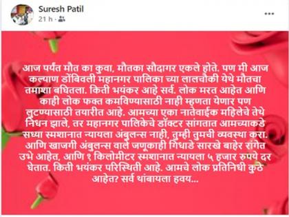 “आजपर्यंत मौत का कुवा, मौत का सौदागर एकले होतं. पण मी आज कल्याण डोंबिवली महानगर पालिकेच्या लालचौकी येथे मौतचा तमाशा बघितला. किती भयंकर आहे सर्व. लोक मरत आहेत आणि काही लोक फक्त कमविण्यासाठी नाही म्हणता येणार पण लुटण्याच्या तयारीत आहे. आमच्या एका नातेवाईक महिलेचे तिथे निधन झाले, तर महानगर पालिकेचे डॉक्टर सांगतात आमच्याकडे सध्या स्मशानात न्यायला रुग्णवाहिका नाही. तुम्ही तुमची व्यवस्था करा. आणि खाजगी अंबुलन्सवाले जणूकाही गिधाडा सारखे बाहेर रांगेत उभे आहेत, आणि 1 किलोमीटर स्मशानात न्यायला 5 हजार रुपये दर घेतात. किती भयंकर परिस्थिती आहे. आमचे लोक प्रतिनिधी कुठे आहेत? सर्व थांबायला हवंय”, अशा शब्दात त्यांनी आपला संताप व्यक्त केला आहे.''