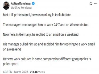 भारतात त्या आयटी कर्मचाऱ्याकडून कंपनी प्रचंड काम करून घेत होती. मात्र जेव्हा तो त्याच कंपनीसाठी जर्मनीत काम करायला गेला तेव्हा तिथले वर्क कल्चर खूप वेगळे होते. एकेदिवशी जर्मनीत काम करताना त्याने सुट्टीच्या दिवशी Email ला उत्तर पाठवले तेव्हा त्याचा मॅनेजर प्रचंड संतापला. सुट्टीच्या दिवशीही या कर्मचाऱ्याने काम केले त्याचे कौतुक त्याला नव्हते. त्या बॉसने वीकेंडला काम केल्यामुळे कर्मचाऱ्याला चांगलेच फटकारले. एकाच कंपनीत वेगवेगळ्या देशात काम करण्याचं वातावरण वेगळे होते. आदित्य कोंडावरच्या या पोस्टवर अनेक भारतीयांनी आपल्या प्रतिक्रिया दिल्या आहेत.