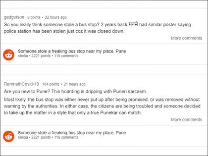 ट्विटर युजर @joleneann123 यांनीसुद्धा हा फोटो शेअर केला आहे. हसण्याची रिएक्शन देऊन पुण्याचा बसस्टॉप चोरीला गेला असं कॅप्शन दिलं आहे. आतापर्यंत या ट्विटला १२० पेक्षा जास्त लाईक्स मिळाले आहेत. अनेकांनी या घटनेकडे गमतीने पाहिले आहे. प्रत्यक्षात असं झालं नसेल असं म्हणत अनेक सोशल मीडिया युजर्सनी जुन्या घटनांचा उल्लेख केला आहे. दोन वर्षांपूर्वी मनसेने पोस्टर लावून एक पोलिस स्थानक चोरी झाल्याचे म्हटले होते. कारण त्यांच्यामते त्या पोलिस स्थानकात पोलिसांकडून समाधानकारक काम केलं जात नव्हते. तसाच काहीसा प्रकार घडला असावा असं अनेक युजर्सना वाटतं. देवमासा ठरला देवदूत! Whale ने केली उलटी अन् 'तो' करोडपती झाला ना राव....