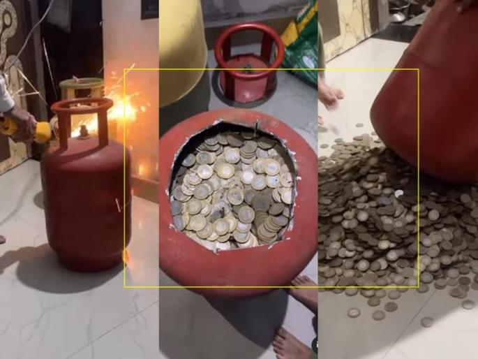 चिल्लर पैसे साठवण्यासाठी लहानपणी गल्ला वापरला जात, या गल्ल्यात काही रक्कम साठल्यानंतर किंवा हा मातीचा गल्ला भरल्यानंतर तो फोडून त्यातील पैसे बाहेर काढण्यात येत. दिवाळीच्या सुट्टीत नेहमी हा अनुभव अनेक घरांमध्ये दिसून येतो. मात्र, चक्क गॅस सिलेंडरच्या टाकीत १०-१० रुपयांची नाणे साठवण्यात आल्याचा व्हिडिओ पाहून अनेकांनी आश्चर्य व्यक्त केलं आहे. तसेच, अनेकांना प्रश्नही पडला आहे की, नेमकं सिलेंडरमध्ये नाणी टाकली कुठून?. सध्या सोशल मीडियावर हा व्हिडिओ चांगलाच व्हायरल झाला आहे. या व्हिडिओवर कमेंट करुन नेटीझन्स मजा घेत आहेत.