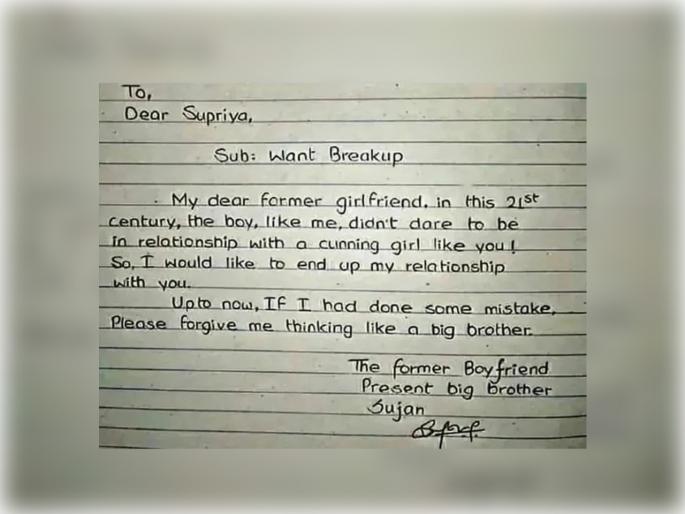 सुजान नावाच्या बॉयफ्रेन्डने आपली गर्लफ्रेन्ड सुप्रियाला हे ब्रेकअफ लेटर लिहिलं. यात त्याने लिहिलं की, माझी प्रिय एक्स गर्लफ्रेन्ड 21व्या शतकात माझी हिंमत नाही की, मी तुझ्यासारख्या मुलीसोबत रिलेशनशिपमध्ये राहू. त्यामुळे हे नातं मला इथेच संपवायचं आहे. जर माझ्याकडून काही चूक झाली असेल तर मला मोठा भाऊ समजून माफ कर'. या लेटरच्या शेवटी बॉयफ्रेन्डने फारच मजेदार लिहिलं आहे. त्याने लिहिलं की, 'माझी बॉयफ्रेन्ड आणि वर्तमानातील मोठा भाऊ'.