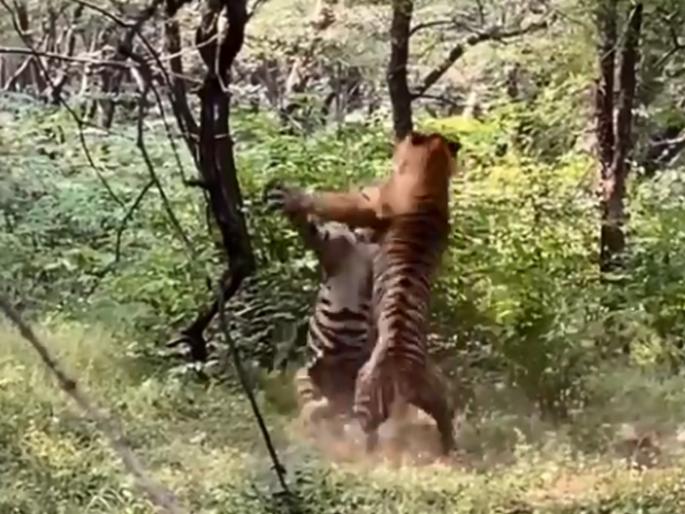 व्हिडीओमध्ये पाहू शकता की, दोघं वाघ भांडत आहेत आणि झाडामध्ये एक वाघीण उभी आहे. पम या दोघांमधील भांडणं वाढल्यानंतर वाघिण तिथून पळून जाते.