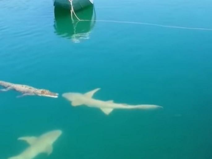 व्हिडिओ क्लिपमध्ये तुम्ही पाहू शकता, समुद्रात एक रिकामी नाव दोरीने सांधलेली आहे. यादरम्यान मगर तिथे येते, तर काहीच वेळात वेगात एक शार्कही तिथे आल्याचं पाहायला मिळतं. हे दृश्य पाहून तुम्हालाही वाटेल की या दोन्ही क्रूऱ शिकाऱ्यांमध्ये आता काहीतरी घडणार आहे. मात्र असंच काहीच होत नाही आणि हे दोन्ही जीव शांततेत तिथून निघून जातात.