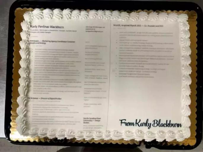 न्यूयॉर्क : अमेरिकेतील नॉर्थ कॅरोलिना प्रांतातील कार्ली पॅवलिनॅक ब्लॅकबर्न या तरुणीने नोकरीसाठी आपला बायोडेटा स्पोर्ट्स साहित्य बनवणाऱ्या प्रसिद्ध ‘नायकी’ कंपनीला पाठवला, तोही अनोख्या पद्धतीने. तिने बायोडेटा चक्क केकवर छापला.