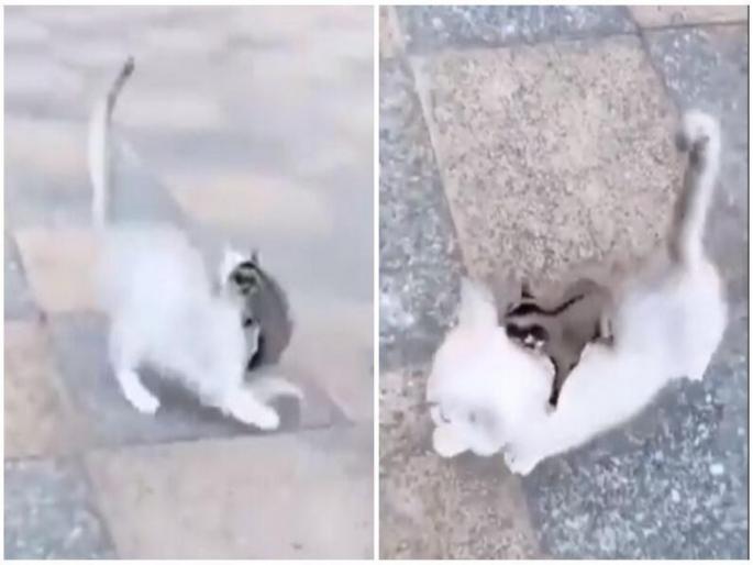 इंटरनेटवर एका छोट्याश्या खारुताईचा आणि मांजराचा व्हिडिओ व्हायरल होतोय. काही व्हिडिओ असे असतात जे आपल्याला अंर्तमुख करायला लावतात. तर काही हसायला लावतात. हा व्हिडिओ अंर्तमुख करणाराही आहे आणि थोडसं हसायला लावणाराही आहे. यात मांजरीची आणि खारीची फाईट आहे पण खारीने मांजरीला धोबीपछाड केलंय.