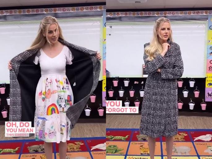 Heather Stansberry नावाच्या इंस्टाग्राम अकॉउंटवरुन या शिक्षिकेनं एक व्हिडिओ शेअर केला असून नेटीझन्सच्या पसंतीस पडला आहे. शिक्षिका हीथरच्या या कमालीच्या गिफ्टचे नेटीझन्सनेही कौतुक केलंय. हीथर या शाळेतील आपल्या शेवटच्या दिवशी वर्गात ओव्हरकोट परिधान करुन आल्या होत्या. मॅडमला या पोशाखात पाहून शिक्षकही आश्चर्यचकित झाले. मात्र, मॅडमने ओव्हरकोट काढताच त्यांनी परिधान केलेल्या ड्रेस पाहून विद्यार्थ्यांना आनंद झाला, ते भावूक झाले. कारण, मॅडम हीथरने परिधान केलेल्या पांढऱ्या ड्रेसवर त्यांच्या विद्यार्थ्यांनी रंगबेरंगी चित्रे काढलेली, नाव काढलेली, रंगवलेली निशाणी दिसत होती.