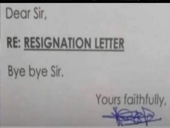 फोटोवर मजेशीर कमेंट्सट्विटर युझर @MBSVUDU ने त्याच्या अकाउंटवरुन या आगळ्यावेगळ्या राजीनामा पत्राचा फोटो शेअर केला आहे. या फोटोला 2 लाखांपेक्षा जास्त लोकांनी लाईक आणि 60 हजारांपेक्षा जास्त रिट्वीट मिळाले आहेत. हा फोटो सोशल मीडियावर चर्चेचा विषय बनला आहे. या पोस्टवर एक युझरने कमेंट केली- "कमीत कमी, हे फॉर्मल आहे." दुसऱ्या एकाने लिहीले- "हा अतिशय सिंपल आणि स्ट्रेट फॉर्वर्ड आहे. कुणालाही एक्सप्लेन करण्याची गरज नाही."
