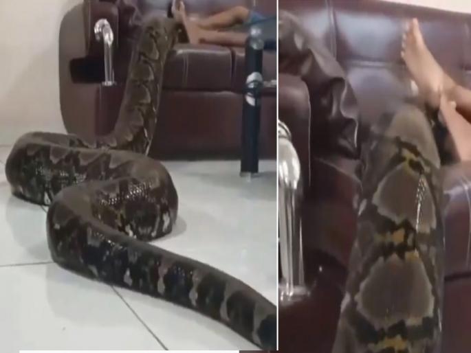 काही सेकंदाचा हा व्हिडीओ लोकांना हैराण करणारा आहे. कारण यात साधारण २० फूट लांब साप घरात सहजपणे फिरताना दिसत आहे. घरातील जमिनीपासून ते सोफ्यापर्यंत हा साप घरात आरामात फिरत आहे. तेच त्याच्याजवळ एक लहान मुलगा झोपलेला आहे. तो अजिबात न घाबरता मोबाइलवर शांतपणे गेम खेळत आहे. त्याच्या हावभावावरून हे लक्षात येतं की, त्याची सापासोबत चांगली ओळख आहे.