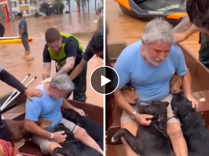 मुसळधार पावसामुळे ब्राझीमधील जनजीवन विस्कळीत झाल्याचं चित्र पाहायला मिळालं. सर्वसामान्य नागरिकांप्रमाणेच या पूराचा फटका मुक्या प्राण्यांनाही बसला. येथे पुरामध्ये अडकलेल्या नागरिकांची सुखरूप सुटका करण्यात आली. या पुरामध्ये तेथील एका श्वानप्रेमी व्यक्तीचा मन हेलावून टाकणारा व्हिडिओ समोर आला आहे. पुराच्या पाण्यात त्या व्यक्तीचे श्वान अकडून राहिले होते. त्यांना पाहण्यासाठी या व्यक्तीचा जीव झुरत होता. अखेर शर्थीच्या प्रयत्नानंतर रेस्क्यू टीमने त्या श्वानांची पुराच्या पाण्यातून सुखरुप सुटका केली. आपल्या लाडक्या श्वानांना डोळ्यासमोर पाहताच त्या मालकाला अश्रू अनावर होतात. या व्हिडिओने नेटकऱ्यांच्या भावनांना साद घातली आहे. पोटच्या लेकारांप्रमाणे जीव लावलेल्या पाळीव श्वानांना तो व्यक्ती मीठी मारून ढसाढसा रडताना दिसतोय.