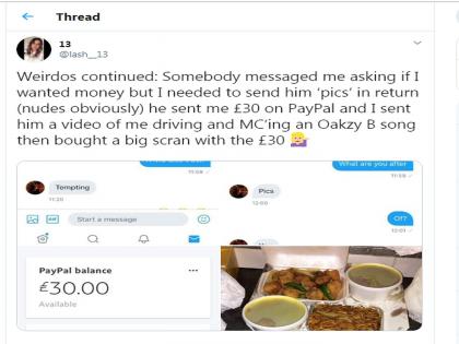 Weirdos continued: Somebody messaged me asking if I wanted money but I needed to send him ‘pics’ in return (nudes obviously) he sent me £30 on PayPal and I sent him a video of me driving and MC’ing an Oakzy B song then bought a big scran with the £30 💁🏼♀️ pic.twitter.com/2LntXqXOh1