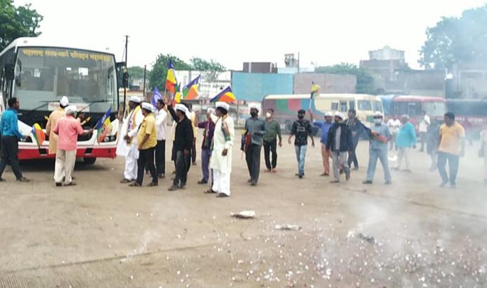वंचितने केला जल्लोष...सोलापूर ते स्वारगेट ही एमएच १३ सीयू ८३३९ एसटी बस सोलापूर स्थानकातून सुटणार होती़ यावेळी वंचित बहुजन आघाडीचे प्रदेश प्रवक्ते आनंद चंदनशिवे, विभाग नियंत्रक रमाकांत गायकवाड यांच्या हस्ते गाडीची विधिवत पूजा करण्यात आली़ यावेळी वंचितच्या कार्यकर्त्यांनी प्रवास करणाºया प्रवाशांना लाडू वाटून, फटाक्यांची आतषबाजी करून आनंदोत्सव साजरा केला़ दरम्यान, प्रवाशांना मास्क व सॅनिटायझर वाटप करण्यात आले़ यावेळी वंचित बहुजन महिला आघाडी राज्य कार्यकारिणी सदस्या अंजना गायकवाड, वंचित बहुजन महिला आघाडी जिल्हाध्यक्षा रेश्मा मुल्ला, पल्लवी सुरवसे, सुजाता वाघमारे, नगरसेवक गणेश पुजारी, बबन शिंदे, श्रीमंत जाधव, नानासाहेब कदम, शिवाजी बनसोडे, हणमंतु पवार, विजय बमगोंडे, रवी थोरात, विनोद इंगळे, चंद्रकांत सोनवणे, देविदास चिंचोळकर आदी पदाधिकारी व कार्यकर्ते उपस्थित होते़