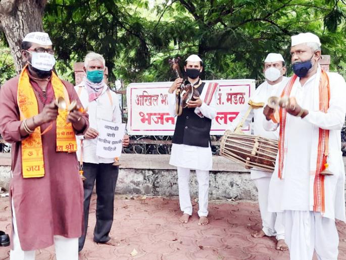 सोलापूर - आषाढी वारीमध्ये पारंपरिक दिंडी व पालखी घेऊन येण्यासाठी किमान 50 भाविकांना अटी व नियम घालून परवानगी द्यावी आणि संबंधित निर्णय बदलून सहकार्य करावे अशी मागणी अखिल भाविक वारकरी मंडळ यांच्यावतीने सोलापूर येथील जिल्हा परिषद गेटसमोर भजन आंदोलन करून देण्यात आले. यावेळी राष्ट्रीय अध्यक्ष ह.भ.प. सुधाकर इंगळे महाराज, बळीराम जांभळे, ज्योतीराम चांगभले, संजय पवार, अविनाश पवार, कुमार गायकवाड, किशोर धायगुडे आदी पदाधिकारी उपस्थित होते.