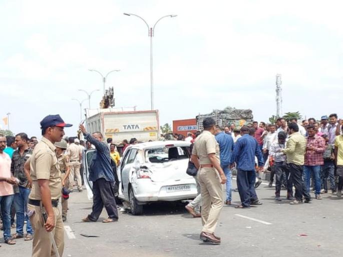 सुप्रिया गणेश नरखेडकर (रा. अनगर, ता. मोहोळ) असे मयत महिलेचे नाव आहे. सोलापूरहून पुण्याकडे निघालेला हायवा टिपर भरधाव वेगात जात होता. यावेळी वेगात असलेल्या टिपरने दुचाकीला जोराची धडक दिली. त्यानंतर कारला धडक देऊन कंटेनर ट्रकवर हायवा आदळला. या अपघातानंतर महामार्गावरील वाहतूक विस्कळीत झाली होती. या घटनेची माहिती मिळताच शिवसेनेचे जिल्हाप्रमुख अमोल शिंदे हे दाखल झाले. पोलिसांनी लावलेल्या नाकाबंदी पॉईंटमुळेच अपघात झाल्याचा आरोप करत आक्रमक शिवसैनिकांनी सोलापूर पुणे महामार्ग काही वेळसाठी रोखून धरला. शिवसैनिकांनी केलेल्या रास्ता रोकोमुळे सोलापूरकडे जाणारी वाहतुक काही काळ थांबली, त्यामुळे वाहनांच्या लांब रांगा होत्या. यावेळी पोलिसांचा मोठा बंदोबस्त होता.